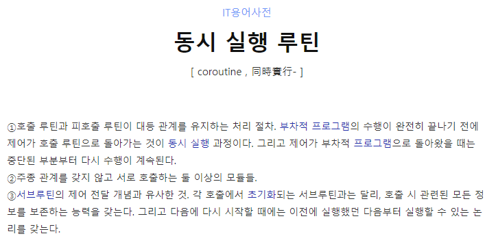 코루틴(coroutine)은 루틴의 일종으로서, 협동 루틴이라 할 수 있다(코루틴의 "Co"는 with 또는 togather를 뜻한다). 상호 연계 프로그램을 일컫는다고도 표현가능하다. 루틴과 서브 루틴은 서로 비대칭적인 관계이지만, 코루틴들은 완전히 대칭적인, 즉 서로가 서로를 호출하는 관계이다.